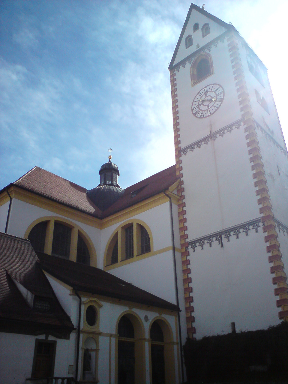 Bývalý benediktinský klášter ve F v diecézi Augsburg založen v 1. pol. 9. stol. jako proprietární klášter biskupů v Augsburgu. Vznik sahá k sv. Magnusovi poustevníkovi, který zde nechal vystavět poustevnu. Po smrti zůstalo jeho tělo neporušené, jako doklad svatosti a vytvořilo duchovní základ kláštera. Založení opatství ale bylo motivováno nejen nábožensky, v pozadí byly i politické zájmy. Nachází se na hlavní středověké silnici z Augsburgu přes Alpy do s Itálie, nedaleko průlomu Lechu přes Alpy. Byl to strategický bod. Historie opatství ve středověku bylo charakterizováno snahami po skutečném životě podle pravidel sv. Benedikta. Tak byla komunita mnichů v průběhu staletí opakovaně uzavřena reformními hnutími, která měla za cíl návrat ke kořenům benediktinského života. Ekonomický boom se projevoval v nových stavebních zakázkách a umění. Protireformace našla svůj výraz v konstrukci mocného barokního kláštera z 1696 – 1726, dominujícímu spolu s vysokým hradem městu F. Opat Gerhard Oberleitner (1696 – 1714) usiloval o dobudování kláštera, čímž zamýšlel "vzbudit závist ve všech milovnících umění". Architekt Johann Jakob Herkomer (1652 – 1717) vytvořil z nepravidelného středověkého opatství symetrický komplex. Transformace středověké baziliky v barokní kostel architektonickým symbolem kultu sv. Manga. Zcela přestavěná budova kostela monumentálním relikviářem světce. Z dřívější doby zachovány jen středověké základy a románská krypta z 9. – 11. stol. V 2. pol. 18. stol. se posiluje sociální funkce: pastorační péče, vědy, hudby a vzdělávání. Opatství lze charakterizovat jako dominantní a ekonomické centrum, jako kulturní ústřední kontaktní místo a centrum víry. 1802 získal v důsledku napoleonských válek a míru v Lunéville klášter do držení knížecí dům Oettingen – Wallerstein. Krátce nato klášter rozpuštěn a musel být vyklizen (1803). 1839 koupil sv. Manga od království bavorského Chamberlain Christoph Friedrich von Ponickau, předtím však 1837 bývalý klášterní kostel předán farnosti. Od té doby, bývalý benediktinský klášter rozdělen mezi dva vlastníky. Nyní je druhým vlastníkem město. Např. knihovna byla při sekularizaci přemístěna a dnes je součástí knihovny Oettingen-Wallerstein z větší části v Augsburgu v univerzitní knihovně. Malá, nejcennější část rukopisů, přišla jako dar archivu diecéze Augsburg. Bývalý klášter: Rozsáhlá barokní budova, dnes radnice a městské muzeum. Barokní krásy, výroba louten a houslí, F tanec mrtvých.