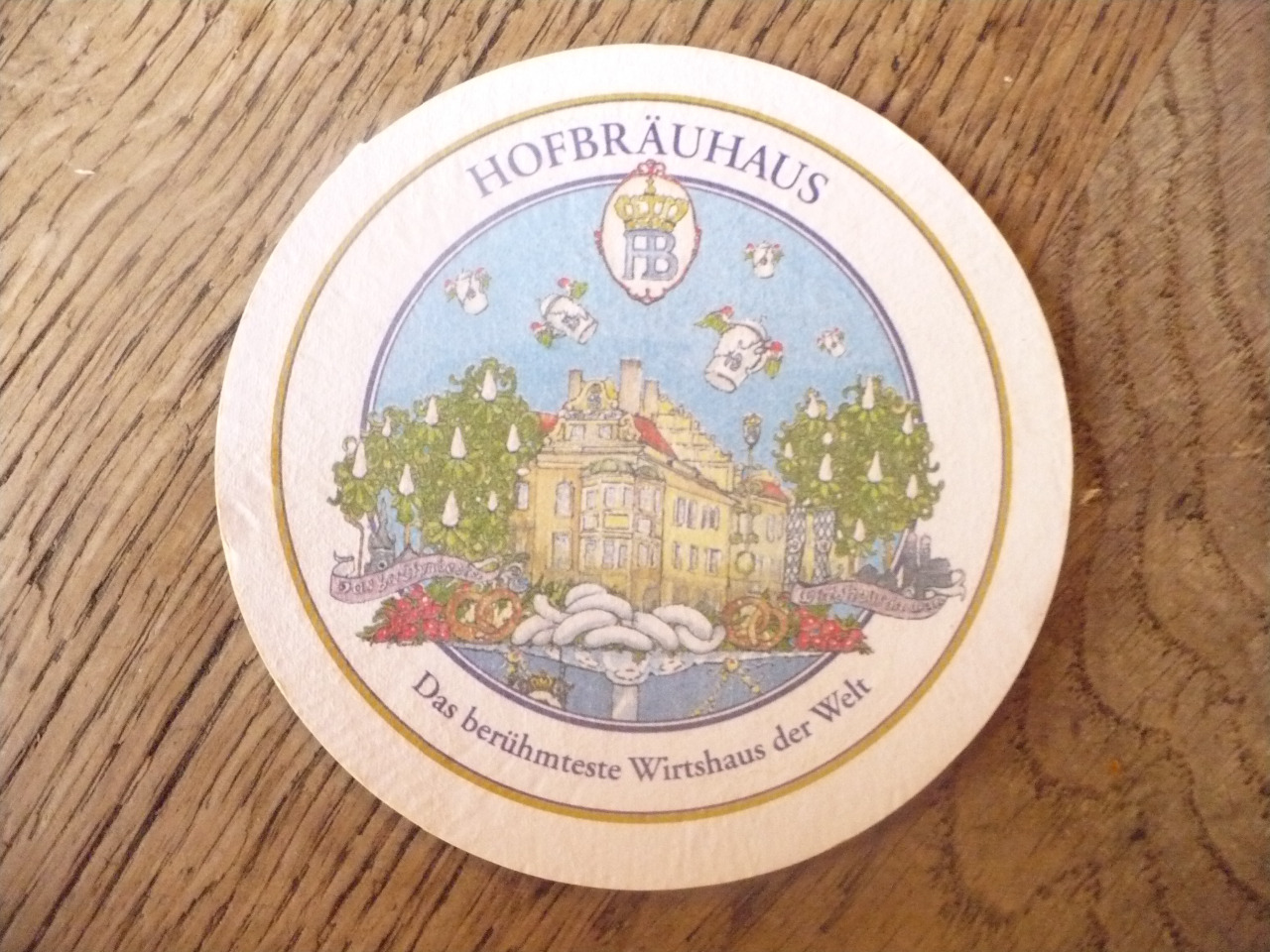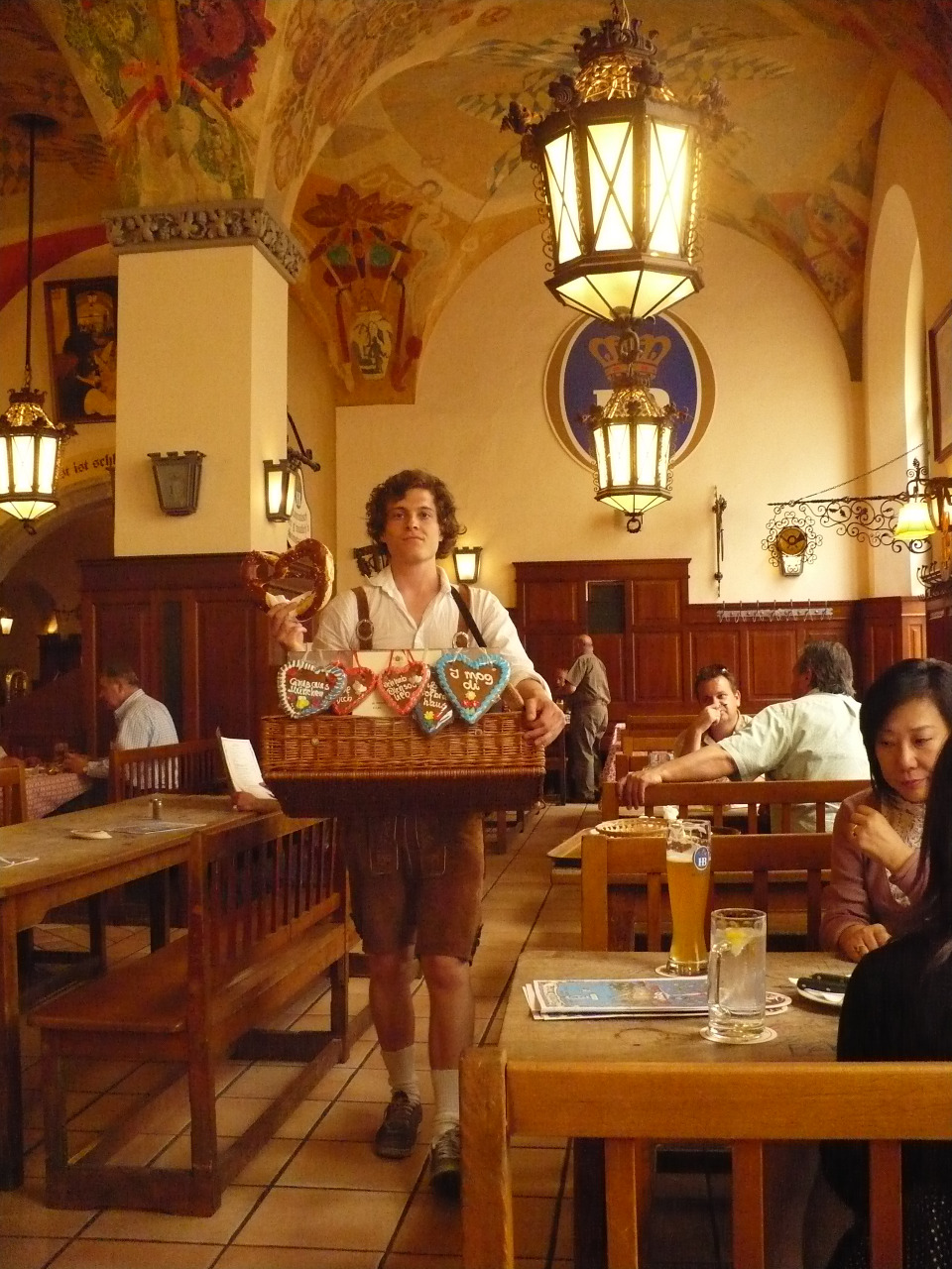 Nejproslulejší to tradiční mnichovská hospoda. Zvenku poměrně nenápadná, uvnitř perfektní místo, v němž jen přízemí má kapacitu tisíc míst. Trochu jsme pohledali místo (některá jsou zabukovaná pro štamgasty) a potom už sledovali okolní cvrkot, zahrnující i klasickou bavorskou dechovku (jen jedinkrát svůj repertoár proložila skvělým zadžezováním). Objednali jsme si oběd. Chlapi vyzkoušeli klasické pečené koleno se dvěma nadýchanými knedlíčky (vynikající, ale stačila by mi půlka), ženy nějaký plátek na cibuli a k tomu brambory na másle, resp. vývar a v něm obrovitánský játrový knedlíček. Popili jsme dunkel v tuplácích, poprohlíželi, pofotili. Já jsem neodolal a zavolal z těchto neskutečných prostor kamarádům. Sledovali jsme neustále proudící skupiny příchozích (hodně Japonců), prodavače s preclíky a perníky a i jinak se bavili. Prošli jsme dostupné části objektu, obdivovali třeba řady uzamčených korbelů štamgastů atd. Paráda!