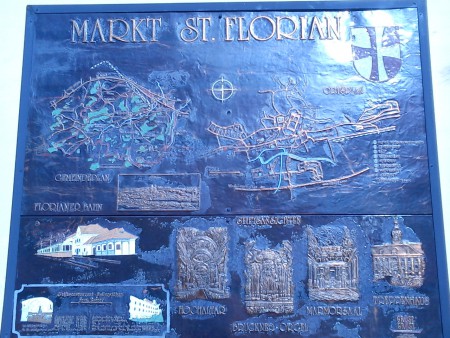 Sankt Florian: Městys v Rakousku, asi 15 km jv od Lince. Nad hrobem sv. Floriána (15 km jv od dnešního Lince) už v 6. stol. vystavěn augustiniánský klášter. Časem změna na klášter benediktinský, později (1071?) klášter kanovníků sv. Augustina. Kostel se poprvé připomíná kolem 800, 1291 po požáru postaven nový, z něhož se zachovala jen krypta. Dnešní velký barokní kostel postaven 1686 – 1708 dle plánů italského architekta Carlo Antonio Carlone. Klášter pak přestavěl Jakob Prandtauer, má tři dvory, "Mramorový sál", obrazovou galerii a knihovnu s víc než 130 tis. svazky (mnoho rukopisů a prvotisků). Malířská výzdoba Bartolomeo Altomonte. Je zde i internát slavného chlapeckého pěveckého sboru Florianer Sängerknaben. V kostele s kopulí nad křížením mohutný hlavní oltář z červeného mramoru, vysoký 20 m a bohatě vyřezávané barokní lavice. V kryptě pohřbena poustevnice Wilbirgis, která nedaleko přes 40 let žila a 1289 zemřela. Na kůru slavné varhany skladatele Antona Brucknera (1824 – 96), který zde dlouho varhaníkem a pod kůrem pohřben. 8 velkých zvonů, 4 z 1318, největší z 1717 (8.640 kg). V bývalých hospodářských budovách hasičské muzeum. Každoroční festival Brucknerovy dny. V obci zemské muzeum Summerauerhof s exponáty ze života místních rolníků v 18. a 19. stol. Blízko barokní zámek Hohenbrunn (myslivecké muzeum).
